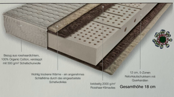 Rosshaar-Naturlatexmatratze -mit Wirkung H18cm- Hochwertige 5 Zonen-Matratze mit 95%Naturkautschukkern die Wirkung ist der perfekte Temperaturausgleich durch Rosshaar und durch die Querkanäle